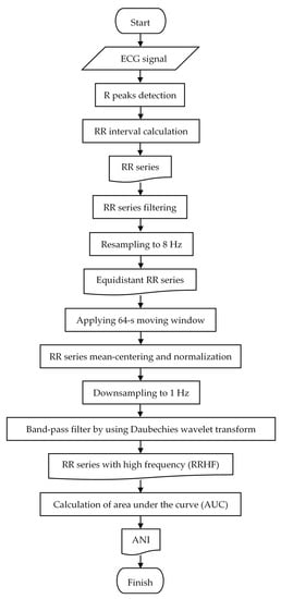 The flowchart shown in Figure 1 summarizes the steps for calculating ANI. As the first step, the R peaks of the ECG signal were detected, in order to obtain the RR interval data (RR series). An ECG signal is often disturbed, causing sudden changes in the measured heartbeat, either extremely fast or extremely slow. When this kind of artifact occurs, the RR series produces incorrect values. Thus, the RR series must be filtered using an efficient algorithm for filtering the RR interval series []. RR series were filtered using auto-adaptive thresholds in a moving window, with a window size of 5 samples, to detect artifacts. Lower and upper thresholds and ) were set for the first through fifth samples in the RR series, with and denoting the mean and standard deviation of the entire series, respectively. Any samples from the first five samples below the lower threshold or above the upper threshold were substituted with the mean of the whole RR series. Then, the following thresholds were applied from the sixth sample until one sample before the last.