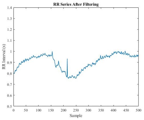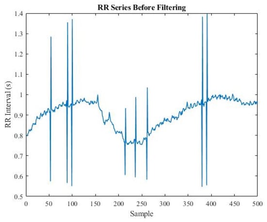 The last sample was replaced by the mean of the previous five samples if it met one of the conditions above. Figure 2 and Figure 3 compare the RR series before and after filtering.