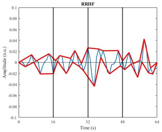 Parasympathetic tone was correlated with ANI measurement, and this tone occurred only at high frequencies of the RR series. A Daubechies wavelet transform with four coefficients was used to band-pass filter the normalized RR series from 0.15 Hz to 0.5 Hz, yielding a time-scale representation of the RR series at different wavelet energy levels. The RR series with high frequency (RRHF) was then taken from the wavelet components 3 to 5. RRHF amplitude was expressed in normalized units (n.u.) and ranged from −0.1 to 0.1 n.u. []. Calculation of the area under the RRHF curve was done to assess the parasympathetic tone. To perform the calculation, the local maxima and minima in the RRHF curve were first detected. A plot of the upper line connected all maxima points, while a plot of the lower line connected all minima points, as shown in Figure 4. The 64-s RRHF window was then divided into four 16-s sub-windows. In each sub-window, the area under the curve (AUC) was calculated. ANI was calculated using the minimum AUC (), which was the smallest AUC of the four, by applying Equation (5) [,].