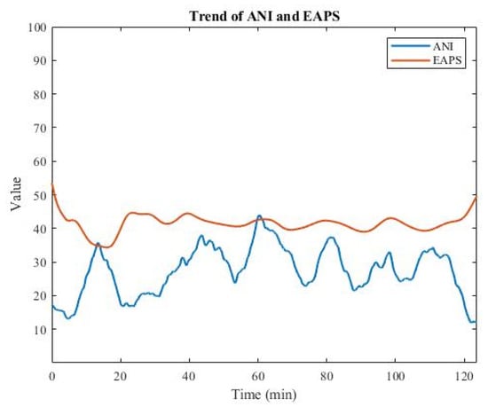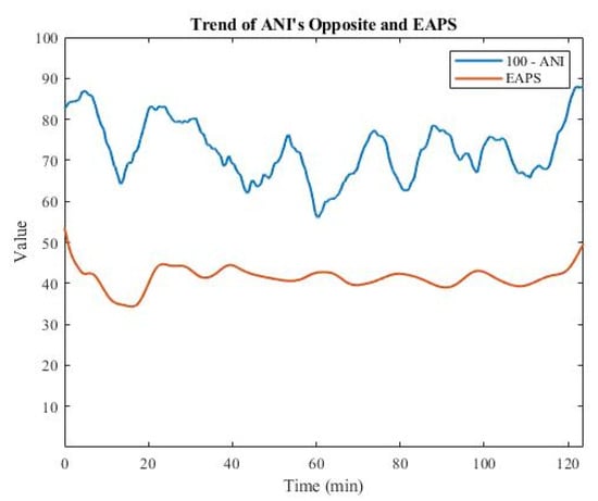 ANI ranges from 0 to 100, similarly to EAPS, but with the opposite trend, as shown in Figure 5. A high ANI indicates high parasympathetic activity or low sympathetic activity, which is associated with low pain. Conversely, a low ANI indicates low parasympathetic activity or high sympathetic activity, both of which are associated with high pain. Next, by subtracting ANI from 100, the opposite value (100 − ANI) was obtained. Figure 6 shows that the opposite of ANI had the same trend as EAPS, so it was used as the input feature for training the deep learning models.