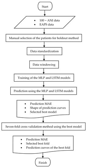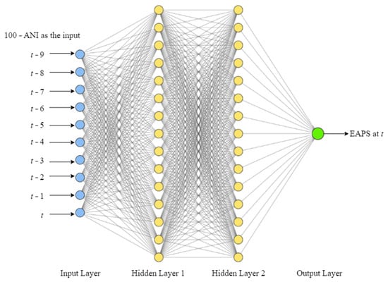 Both the training and validation sets were assigned with a batch size of 32. After that, all batches of the entire data were brought into the MLP model. As illustrated in Figure 11, there were ten input nodes (based on ten time steps of 100 − ANI) and one output node in the MLP model. There were two hidden layers between the input and output layers, with 32 neurons each. The prediction curve did not fluctuate at all when less than 32 neurons were used in each hidden layer, so only a flat line could be generated as the prediction results. The prediction curve deviated farther from the target label curve when more than 32 neurons were used in each hidden layer or more than two hidden layers were used in the architecture, so the mean absolute error (MAE) increased. To maintain the scale of the data, batch normalization was applied in each hidden layer. In those two hidden layers and the output layer, sigmoid activation function was used. Before training the model, all labels were divided by 100, in order to comply with the sigmoid activation function (which ranges from 0 to 1). To make sure the model′s predictions were in line with the range of EAPS (0–100), the results were multiplied back by 100. The parameters were updated during training using Adam optimizer with a default learning rate of 0.001. Adam was chosen as the best optimizer for this MLP model because the other types of optimizers could not achieve the minimum validation loss. Following that, 30 epochs were run for training and validation. To see how well the model performed in predicting for different patients, the trained MLP model was used to predict the testing set.