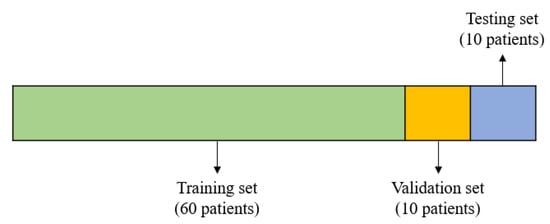 The holdout method was used to build the initial deep learning models and compare their performance, by manually selecting 60 patients for training, 10 for validation, and 10 for testing. Figure 8 illustrates the holdout method.