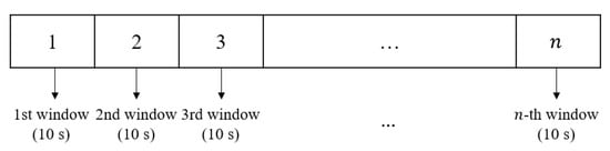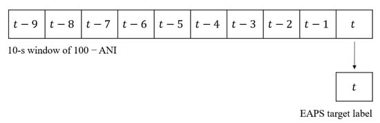 Each window of the input feature consisted of 10 data points, and each window moved for 10 s. As illustrated in Figure 9, the windows did not overlap because the moving period was 10 s. In every window, the EAPS at the current time (at ) was predicted based on the last 10 s of 100 − ANI (from to ), as shown in Figure 10. Table 1 shows the proportion of the data in the holdout method after windowing.