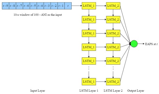 In the LSTM model used in this research, the training and validation sets were assigned with a batch size of 32. Next, the 10-s windows of 100 − ANI were brought into the LSTM model, which had two stacked LSTM layers between the input and output layers, as illustrated in Figure 13. Each LSTM layer consisted of 32 LSTM cells. The prediction curve did not fluctuate at all when less than 32 cells were used in each LSTM layer, so only a flat line could be generated as the prediction results. When an LSTM layer had more than 32 cells or when more than two LSTM layers were used in the architecture, the prediction curve fluctuated excessively and its position deviated farther from the target label curve, resulting in a higher MAE. To maintain the scale of the data, batch normalization was applied to each LSTM layer. The output layer was activated using sigmoid function. Additionally, Adamax optimizer was used to update the parameters during training, with a default learning rate of 0.001. The validation losses obtained from other types of optimizer did not differ significantly from the validation losses obtained from Adamax optimizer during the trials. The prediction results, however, only appeared as flat lines when other optimizers were used. In other words, for this LSTM model, Adamax was the only optimizer that could generate fluctuations in the prediction curve. Following this, 15 epochs were run for training and validation. More than 15 epochs of training and validation did not lead to any improvement, because the model never converged, which meant the validation loss always stayed close to the training loss. In other words, the validation loss curve never intersected the training loss curve.
