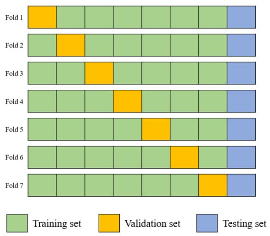 The best model was obtained. By using that model, 7-fold cross validation was applied, as shown in Figure 14. In this method, the testing set is the same as that used in the holdout method, so the remaining 70 patients were rotated between the training and validation sets. As for the validation set, 10 patients were randomly selected for each fold. Patients who had already entered the validation set in a fold did not enter the validation set in subsequent folds. As a result, they were included in the training set in other folds. To determine the best fold, the fold with the lowest prediction MAE was chosen.