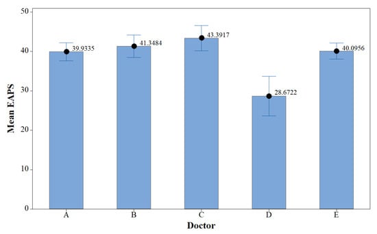 In order to check whether the distribution of EAPS data from the five medical doctors was similar, analysis of variance (ANOVA) was performed. The interval plot in Figure 15 shows that Doctor D gave a significantly lower EAPS, with a P-value of less than 0.05. Therefore, Doctor D′s EAPS was excluded. Accordingly, for every patient, there were four EAPS values from four medical doctors (Doctors A, B, C, and E), as shown in Figure 16. To train the deep learning models, the average of the four EAPS values was assigned as the target label.