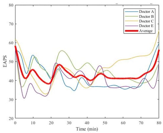 The nurses observed the entire surgical process and took notes regarding clinical events and signs, such as HR and ABP measurements, types of hypnotics and analgesics, patient′s movements, and unusual responses. The expert assessment of pain score (EAPS) was calculated separately after the surgical operation was finished by five medical doctors (Doctors A, B, C, D, and E) with professional experience in surgical operations. A higher EAPS indicates a more painful surgery. Based on their clinical knowledge and experience, these five doctors interpreted the notes or recordings provided by the nurses to determine the EAPS. The patients were not in contact with them in this case. EAPS curves were plotted on recording papers by hand. These papers were then scanned and digitized into numerical data, with one data point of EAPS for every second [].