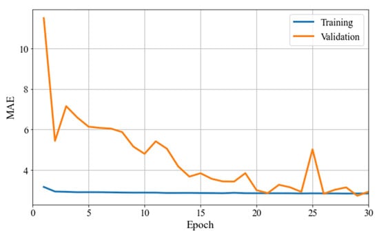 According to the holdout method, training and validation loss curves were obtained from both MLP and LSTM models after 30 and 15 epochs of training and validation, respectively, as shown in Figure 17 and Figure 18. Each loss value was multiplied backwards by 100, to match the real range of EAPS. Table 2 shows the training and validation losses of both models in the last epoch.
