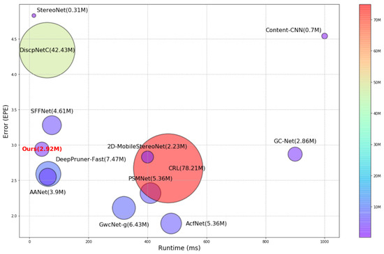 Figure 9 shows a qualitative comparison between the MSFFNet and other networks [12,17,26,28] on the Scene Flow test set. This comparison demonstrates that our network predicts disparity maps comparable to other 2D/3D convolution networks for most regions.