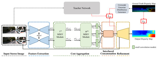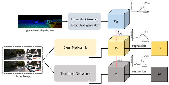 Moreover, the proposed ACVF loss adds a constraint to the estimated cost distribution, using both the ground truth disparity map and the probability distribution map generated from the teacher network with higher accuracy. Thus, a unimodal distribution is generated with the ground truth disparity value [18], and the distribution generated from the teacher network is utilized for knowledge distribution [21,22,23] which transfers the dark knowledge of the cumbersome teacher network to our network as student. However, there are some pixels for which the teacher network is not accurate and that negatively affect the student network. To avoid the negative effects of the distillation [22], the distribution from the teacher network is adaptively transferred using the ratio between the errors of the teacher and our proposed networks for each pixel. Because the proposed loss function does not require additional parameters and computations for inference, it allows us to consider the effectiveness of the direct supervision of the cost volume while maintaining the efficiency of our network. As shown in Figure 1, our proposed network predicts a reasonably accurate disparity map with an extremely fast runtime using small numbers of parameters compared with other efficient stereo-matching networks.