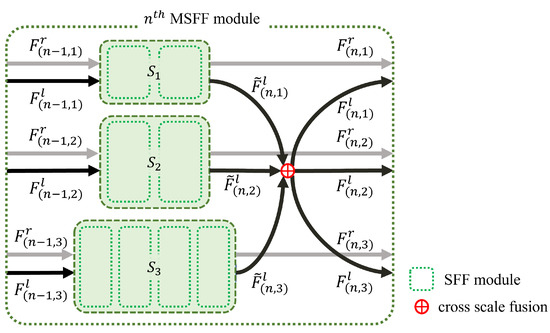 Next, the output feature map of scale s in the nth MSFF module is obtained by fusing the intermediate feature maps with the cross-scale fusion function , which is defined as