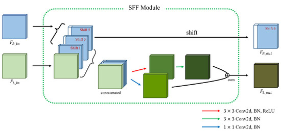 From the multi-scale feature maps and obtained using the feature extractor module, the proposed cost aggregation module generates various cost volumes with different spatial resolutions. To this end, we propose an MSFF module that acts as a building block for the cost aggregation module. Concretely, the cost aggregation module consists of a series of M MSFF modules followed by a small convolution layer. As shown in Figure 3, each MSFF module consists of combined SFF modules [17] with different scales and a cross-scale fusion operation that combines them so that they share different scale information. Specifically, MSFF module generates feature maps and which are inserted to the next MSFF module from and , where the input of the first MSFF module is the feature maps and , that is, and . In the MSFF module, generates the intermediate feature maps and from and . To prevent heavy computations and memory consumption, only with the smallest scale processes the entire disparity range, whereas the others, including and , process only odd disparities of the full search range. In more detail, only processes the entire disparity range, which amounts to 1/16 of the maximum disparity range through two SFF modules [17]. Thus, as shown in Figure 4, the input right feature is shifted by only one pixel to the right at a time in the SFF module. However, as shown in Figure 5, and process only odd disparities by shifting and 2 pixels to the right, respectively, unlike the original SFF module [17]. This reduces the computation and parameters of and by half compared with processing the entire disparity range at that scale.