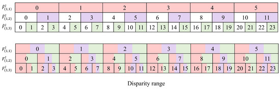 Figure 6 illustrates the disparity range covered in the first MSFF module, where bins with white color represent absent disparity values that are not included in the feature maps. A disparity value d in corresponds to for and corresponds to for owing to scale difference. For the first MSFF module, the feature map from module includes the disparity range of on the scale because each SFF module in covers three disparity values, and two SFF modules are serially connected. Similarly, covers disparity range in the scale using two SFF modules without even disparity values. Similarly, covers the disparity range of on the scale with only odd disparity values. As shown in Figure 6, after the cross-scale fusion process, there is not absent disparity value for each feature map , which compensates for the lack of even values of disparity information by fusing information from different scales.
