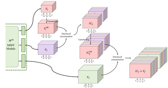 We propose an interlaced concatenation method to combine the multi-scale cost volumes and produce the final cost volume for disparity regression. Here, i represents the scale index, and and are times the width and height of the input image , respectively. , , and are , , and times the maximum disparity search range, respectively. As shown in Figure 7, is obtained by upsampling the cost volume only in the spatial domain to achieve the same spatial resolution as while maintaining the channel dimension. Then, the upsampled and are interlaced along the channel direction to generate an interlaced cost volume , where the value of of spatial position and channel is defined by