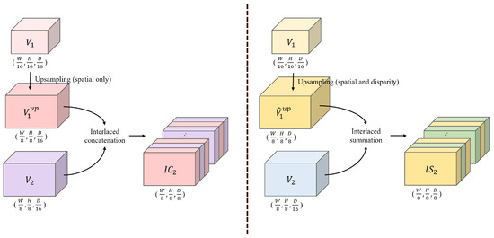 where n denotes the channel index of and . When the interlaced concatenation is performed, the disparity channels from the lower scale are placed at the even number disparity. The final cost volume , which is also , can be generated in the same manner using and .