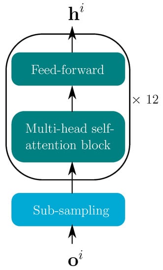 where are the learned parameters, and h is the number of attention heads. In the attention mechanism, the attention transform matrix indicates the relevance of the current keys for the current queries. is of size , where and are the lengths of Q and K, respectively. A fully connected layer is used in the self-attention block to project the concatenated outputs of all heads . Finally, the output of the self-attention block is input to a feed-forward layer, which yields the encoder output .