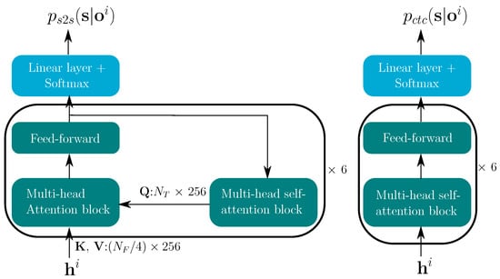 Figure 4 shows the TM-CTC decoder components for each stream. As in the baseline model [9], the CTC decoder consists of a stack of six multi-head self-attention blocks and the output layer. The transformer decoder is comprised of a stack of six decoder blocks, each containing a multi-head attention block. For each decoder, the keys () and values () are the encoder outputs —both of size . The queries () come from the previous decoder block and are transformed by a multi-head self-attention block. is a × 256 matrix, where represents the length, or the number of tokens, of the transcription. In the decoder, the attention transform matrix is of size , which transforms the sequence length from to . Hence, the length of the transformer posteriors is .