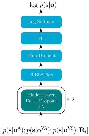For the hybrid model, there were 41 reliability indicators, therefore, the input of the DFN was 11,609 dimension. The three hidden layers in Figure 6 contain 8192, 4096 and 1024 units, respectively, each followed by a ReLU activation function, layer normalization (LN) and with a dropout rate of 0.15. After hidden layers are three BLSTM layers with 1024 memory cells for each direction, with the tanh activation function. A fully connected (FC) final layer projects the data to the output dimension of 3856. A log-softmax function finally yields the log-posteriors.