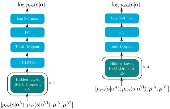 As shown in Figure 7, in the E2E model, the single-modality posteriors are the inputs and, together with the corresponding reliability information, they are used to estimate the multi-modal log-posteriors, , for both the CTC and the S2S model. Both and in Figure 7 start with three hidden layers, which have 8192, 4096 and 512 units, each using the ReLU activation function and layer normalization (LN).