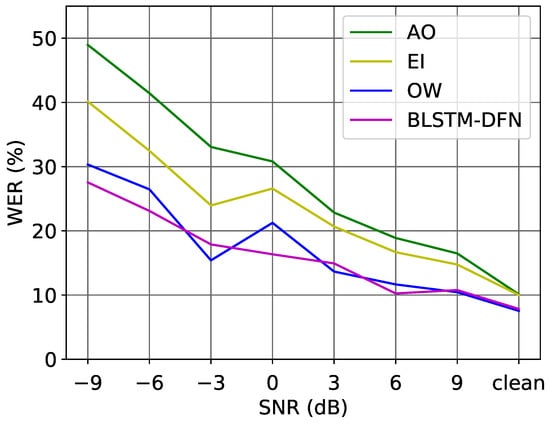 To compare the performance of the hybrid model and the E2E model directly, and an additional audio-only model was trained on the LRS2 corpus. The E2E audio-only model yielded a WER of 3.7%, while the hybrid audio-only model showed a WER of 11.28%. Table 8 shows the experimental results in all noise conditions. As expected, the audio-only model outperformed the video-only model. Comparing the performance between the baseline by [9] and our proposed AVSR model, our introduced DFN resulted in a better performance in all noise environments. Even in clean acoustic conditions, the proposed model clearly reduced the WER.