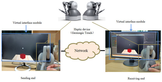 In addition to the haptic signals captured by Geomagic Touch, the sending-end also records the visual contents of the virtual space, resulting in a high-definition video at a resolution of 1920 × 1080. Then the video is compressed by High Efficiency Video Coding (HEVC) and subsequently delivered with haptic signal by the network via User Datagram Protocol (UDP). Finally, the receiving-end combines both haptic and visual signals for a more immersive tele-presence, where another user can watch the scene in real time and also feel the haptic sensing via a haptic device.