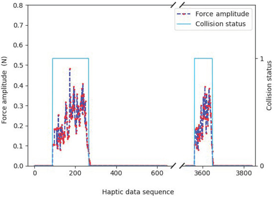 The haptic and visual signals should be fully synchronized under normal conditions. Based on this simulation platform, we can observe the sequential correlation between haptic and visual signals. As shown in Figure 2, strong haptic signal fluctuations exist when the virtual hand (i.e., the ball) is on a collision course with another object. When the virtual hand visually touches the box, the force amplitude of the haptic changes simultaneously. As the two objects move closer, the force amplitude is also higher and vice versa. The force amplitude recovers to a constant when all objects are detached. These changes are also intuitive to the human users when operating a haptic-aware handle.