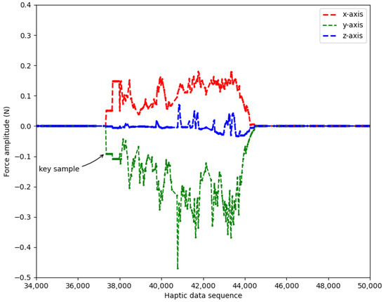 For the haptic signal, the key samples are easily obtained for it consists of three one-dimensional signals (in x-axis, y-axis and z-axis). A sharp increase of force amplitude is found when its difference in any dimension is larger than a threshold (namely ). Through observations on a large number of samples, we found that the fluctuations of force amplitudes during non-collision are always below 0.01, and the force amplitudes of key samples are always above 0.07. Therefore, the is empirically set as 0.05 in our work.