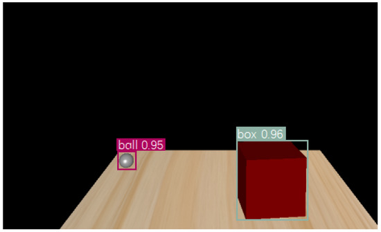 After training, an example of a recognition result is shown in Figure 5 in which the virtual hand (i.e., the ball) and the box are detected, with their borders labeled by rectangular frames.