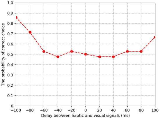 As shown in Figure 6, the probability of correct choices is around 0.5 when the delay of visual signals ranges from −60 ms to 80 ms. In other words, the human users cannot perceive the difference between delayed and non-delayed signals in this range. Therefore, we set the threshold of synchronization as = −60 ms, = 80 ms.