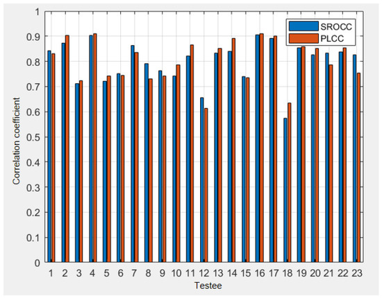 The collected subjective test results were pre-processed to remove outliers based on the ITU subjective test regulations. We calculated the correlations, including the Pearson Linear Correlation Coefficient (PLCC) and the Spearman Rank-Order Correlation Coefficient (SROCC) [31], between each subject’s score and the MOS. The results are shown in Figure 8. According to ITU-R BT.500 [29], a subject’s score is considered as an outlier if the correlation between his/her score and the MOS is less than 0.7. Therefore, from Figure 8, the 12th and 18th subjects are considered as outliers and subsequently excluded in the final results.
