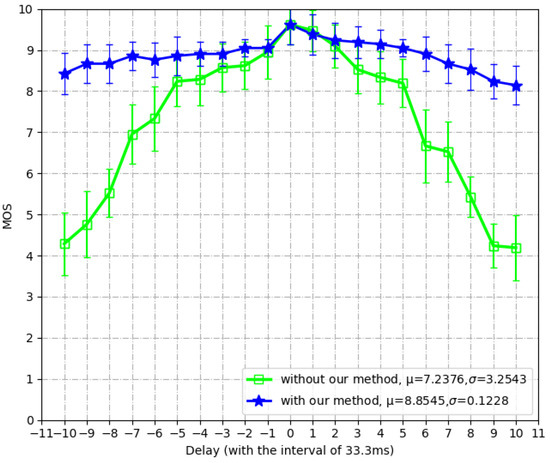 We recruited 23 subjects to participate in this test, where all haptic–visual sequences are also the same to those in Section 4.1. The subjects’ ages ranged from 17 to 26, and they have no exposure to the haptic-based system. To calculate the correlations, we introduce the delays that are evenly distributed from −10 to 10 frames (that is, ranged from −333 ms to 333 ms with the interval of 33.3 ms) and occasionally utilize the proposed synchronization method at the receiving end. However, whether or not we are using the synchronization is unknown for all subjects. As a result, a subject scores his/her experience based on real feelings and experiences. All scores are between 0 and 10 and their averaged value, the Mean Opinion Score (MOS), represents the average perceptions of human users.
