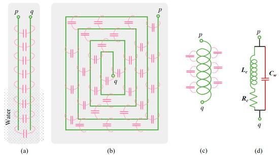 Figure 1b shows an easy-to-fabricate planar coil, with turn-to-turn parasitic capacitance. When the coil is excited using a time-varying voltage, e.g., a sinusoidal signal, the voltage level of individual turns is different as there is current through the parasitic capacitances. Thus, if we consider the input impedance of the coil across its terminals, there is a contribution due to the parasitic capacitance. If the coil is partially or completely immersed in water, the values of these parasitic capacitances increase as in the case of the capacitive level sensor illustrated in