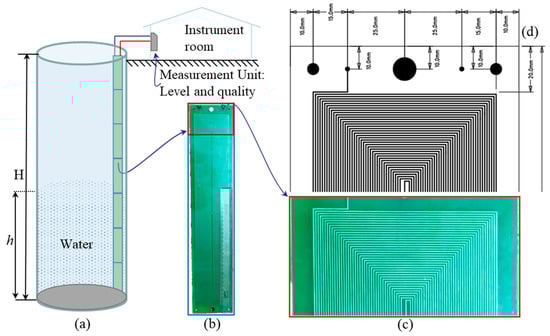 In (1), , , and are the inductance, capacitance, and resistance of the coil, and is the angular frequency of excitation, and is the frequency of excitation. and are functions of level (h), conductivity (), and skin depth () of water, as mentioned above. changes as a function of the temperature T of the water to which the coil is exposed.
