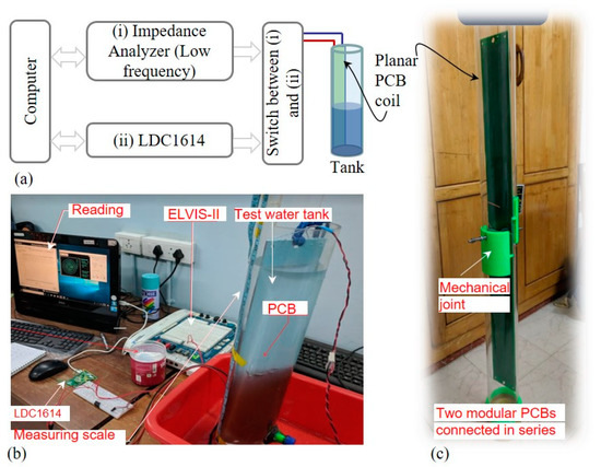 Figure 3. The prototype PCB was introduced into a small tank for testing. The terminals of the PCBs were connected to a switch that can switch the coil between (i) a low-frequency impedance measurement unit, and (ii) an inductance-to-digital converter (LDC), LDC 1614 from Texas Instruments, which has 28-bit resolution. For (i), the impedance analyzer of ELVIS-II, from National Instruments was employed. As illustrated in the block diagram in