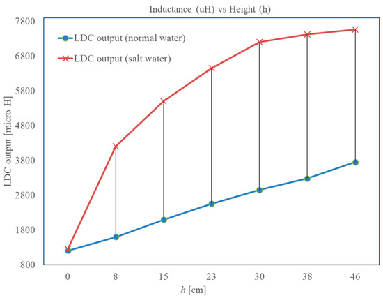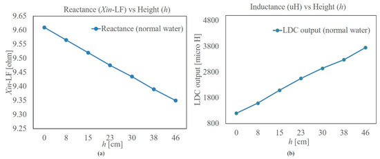 Figure 4b, it can be observed that the output of the LDC increases with level. It has been understood that this effect occurs due to the increase in the capacitance of the planar coil due to the high permittivity (relative permittivity of 80) of the water. Additionally, at resonance frequency, inductive and capacitive reactances have equal value; furthermore, the change (increase) in capacitance is more than the decrease in