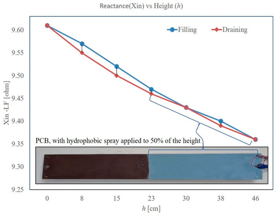 It has been observed from the initial studies that the reactance measurement results exhibit a hysteresis effect; the characteristic differed when we drained the water compared to filling it. We identified the source of this error as the presence of a water layer and droplets sticking to the PCB when we drain the water. To remove this error, we applied hydrophobic paint on all sides of the PCB. To confirm the improvement, we first painted half of the total height of the PCB, as shown in