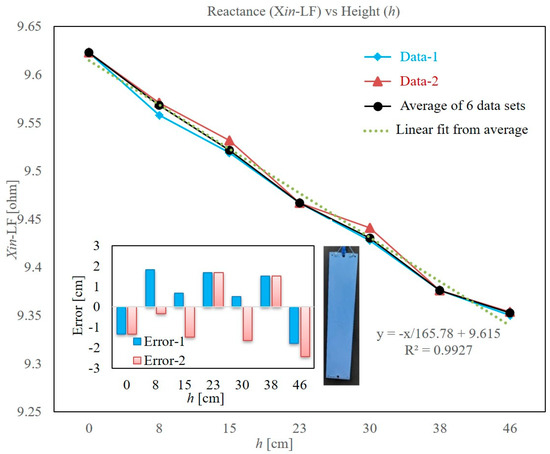 Figure 6. It can be seen that the maximum deviation from the estimated level is 3 cm. Resolution of the measuring tape (0.25 inch = 0.635 cm) employed contributes to this deviation. The primary focus of this study was to observe the overall characteristic and its repeatability. The study confirms that the proposed level sensor is repeatable, and the level can be estimated with good accuracy by using the linear-fit equation. Accuracy can be improved if an instrument with higher accuracy is used for the impedance measurement at 1 kHz.