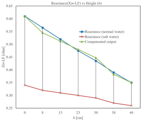 Figure 7. As can be seen, the reactance of the salt water at 1 kHz is much less than that of normal water, but the linearity of the output is retained even when the water is conductive. The reduction in sensitivity and offset is expected as the eddy current is higher in the salt water, as it has higher conductivity than normal tap water. Because of this, the inductance of the coil decreases. Thus, the results are as expected. However, this introduces a large error in the level estimation if we use the same linear-fit equation. To correct for this, a compensation method is needed. For this, we propose to introduce a small PCB at the bottom of the measurement PCB. It can be a square-shaped PCB with only a centimeter of width, and can be kept horizontal to the level-measuring PCB. Reactance of this new, small PCB is sensitive only to the conductivity and not to the level of the water, as it is kept horizontal to the main sensing PCB. Hence, the effect of conductivity on the level can be corrected if the ratio of reactance of the level-sensing PCB to that of the small reference PCB is taken. Such a correction is applied and the compensated results are shown in
