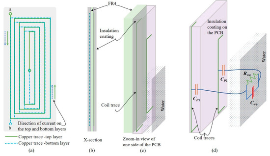 Figure 1a. At the same time, as the typical tap or drinking water is relatively conductive, there is an eddy current in the water. This is produced by the time-varying magnetic field of the coil when it is excited using a time-varying voltage. The magnetic field produced by the eddy current opposes the field caused by the measurement current in the coil, leading to a reduction in the flux linkage and, hence, reduction in the self-inductance value of the coil. If the water’s conductivity is higher, this effect is greater, leading to more reduction in the inductance of the coil. This is a function of the frequency of excitation, used to measure the inductance, as the skin depth of the water varies with conductivity. The planar coil has an insulation layer, which ensures no direct contact of the coil with water. There is parasitic capacitance that predominately comprises the capacitance formed due to the conductive coil surface, the insulation in front of it, and the water (relatively conductive) in immediate contact with it. As the water becomes more conductive, the effective capacitance changes (higher) when the coils see less conductive water. Thus, the coil’s impedance has information about the level at which water is present and its conductivity. The coil with self-inductance, parasitic capacitance, and winding resistance is represented by using the simplified (lumped) electrical equivalent circuit, which is shown in