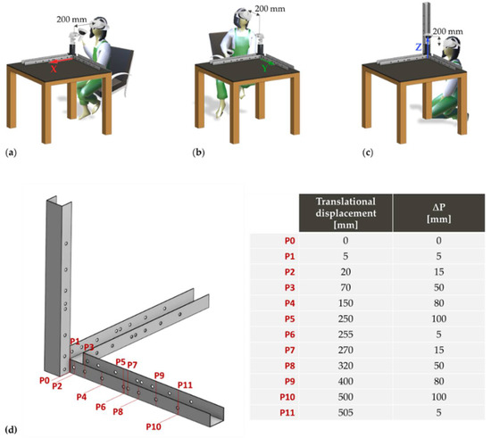 Acquisition configuration of translational displacements along the (a) x-axis, (b) y-axis, and (c) z-axis, starting at a distance of about 200 mm from the reference position P0; (d) representation of translational displacements Pi (i = 1, …,11) and variations (, i.e., differences between translational displacements and .