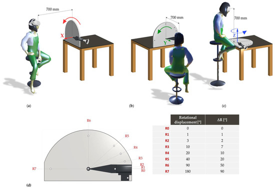 A custom structure was realized to move controller A around each axis (x—roll, y—pitch, and z—yaw) (Figure 4). The selected rotation interval ranged from 0° to 180° to cover the range of motion of the upper limb [28]. All the rotational displacements were performed by placing the HMD at a distance of about 700 mm from controller A during all the rotational displacements in the range 0°–180°. A total of eight rotational displacements (, with i = 0,…,7) were reached by controller A seven times in every task, returning at each repetition to the starting position , for a total of 14 rotational displacements. At each , controller A was left stationary for 5 s. A total of N = 294 (14 rotational displacements × 7 repetitions × 3 axes) static samples were acquired.