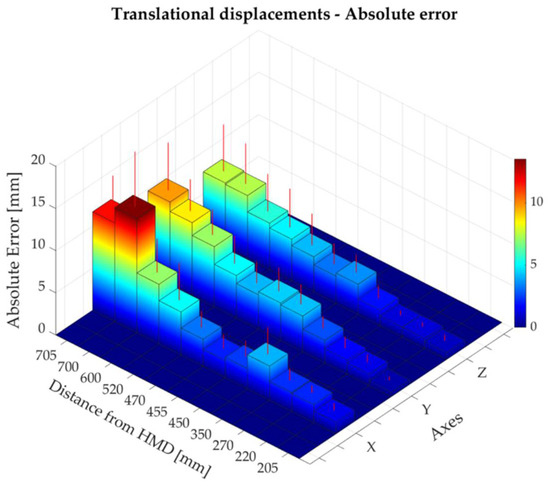 Absolute error along the x-, y-, and z-axes at different distances from the head-mounted display (HMD).