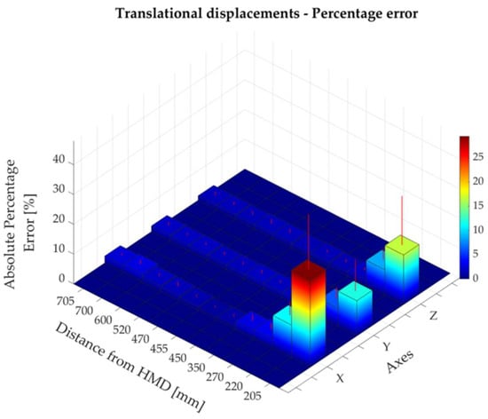 The percentage error along the x-, y-, and z-axes at different distances from the head-mounted display (HMD).
