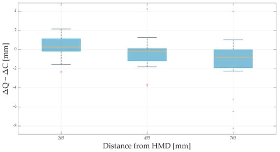Error corresponding to the increment of 5 mm at the distances of 205 mm, 455 mm, and 705 mm from the head-mounted display (HMD).