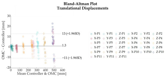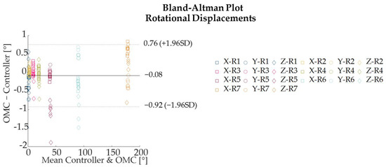 For both translational and rotational displacements, Bland–Altman analysis was performed to quantify the degree of agreement between the two measurement systems by defining the 95% limits of agreement (LOA), which estimates the interval where 95% of the differences between both systems fall [29]. LOA were expressed as MOD ± 1.96⋅SD where MOD represents the mean of difference and SD the standard deviation of the difference between the Qualisys OMC and Oculus Quest 2.