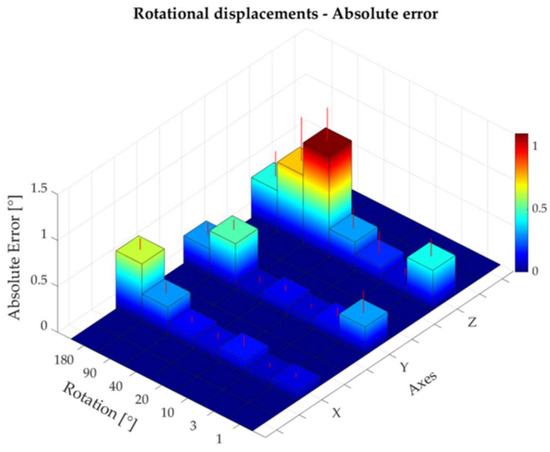 The absolute and percentage errors corresponding to all the rotational displacements performed around the three axes are reported in Table 3. The maximum absolute error—expressed as mean ± standard deviation—was found to be 1.11 ± 0.37° for a rotation of 40° around the z-axis (Figure 9). The higher percentage errors were found to be 5.9%, 42.9%, and 42.6% for a rotation of 1° around the x-, y-, and z-axis, respectively (Table 3, Figure 10). The rotational displacements of 1° around all axes corresponded to a small absolute error of 0.10 ± 0.05 mm, 0.31 ± 0.25 mm, and 0.43 ± 0.19 mm for the x-, y-, and z-axes, respectively. Bland–Altman analysis showed acceptable agreement between the two measurement systems with LOAs within 1.7° and MOD equal to −0.08° (Figure 11).