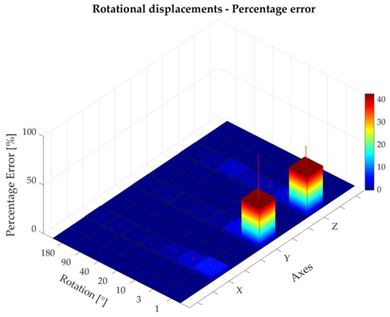 The percentage error corresponding to rotational displacements around the x-, y-, and z-axes.
