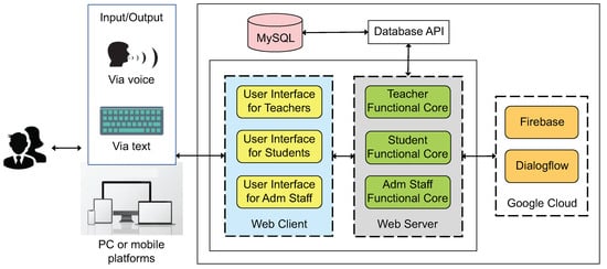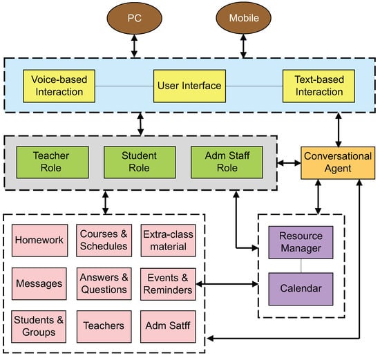 Our model also defines several roles for interaction with a chatbot (e.g., teacher, student, and administrative staff); each one accomplishes particular tasks in the teaching and learning process. Thus, for example, regarding users who play the student role, they can receive tips for their classes, plus reminders of project deadlines and exam dates. For the teacher role, they can receive questions from students and recommend exercises and supplementary material to reinforce particular topics. To provide an easier means of interaction for less tech-savvy people, our model defines components with voice and text user interfaces.