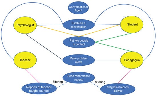 - Receive alerts from the conversational agent about a student with emotional problems; e.g., as a result of a conversation with the student, the conversational agent can direct them to the psychologist or social worker, with prior consent of the student (psychologist and social worker subroles).