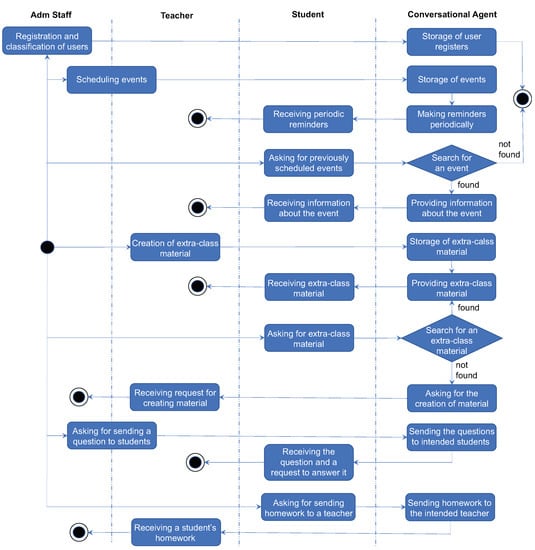 In particular, the use and development of chatbots begins to attract academic institutions [13,14], since they can be valuable help for both students and teachers to obtain and provide information about procedures, school services, and courses, among others [15,16]. Nevertheless, most of these chatbots have limited mechanisms to provide adequate support to the learning and teaching process, as they must be profitable for both students and academic staff (e.g., teachers, pedagogues, psychologists, and social workers).